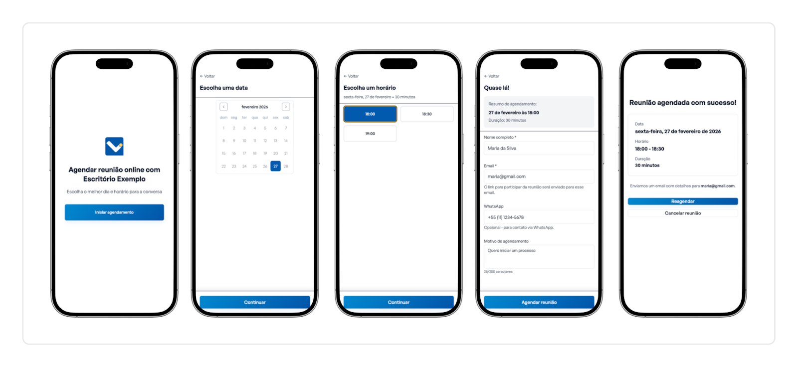 Após o agendamento ser concluído, o cliente receberá um e-mail com a confirmação e os detalhes da reunião, como data e horário, e o link para a reunião online no Google Meet. Ao mesmo tempo, o escritório receberá por e-mail as informações do cliente e demais dados da reunião, com data, horário e link do Google Meet para a reunião online, e o horário será reservado automaticamente na agenda.