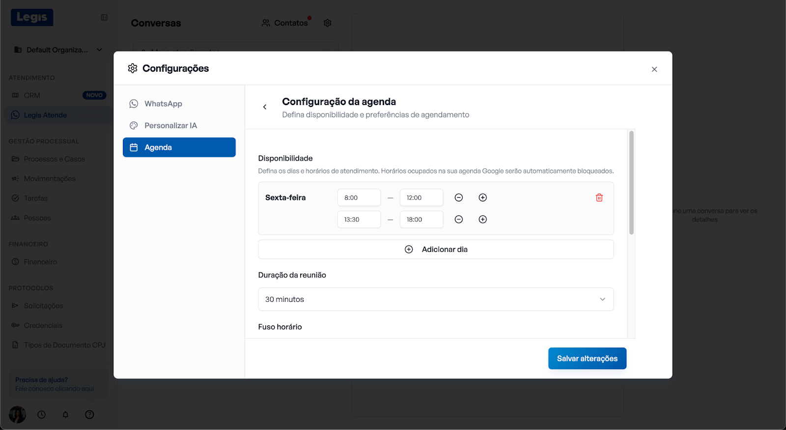 Defina suas preferências de agendamento de acordo com as necessidades do escritório.