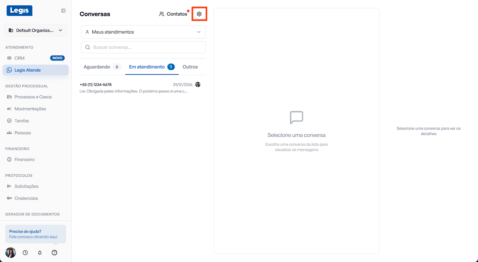 Acesse o painel do Legis Atende e clique no ícone de engrenagem.