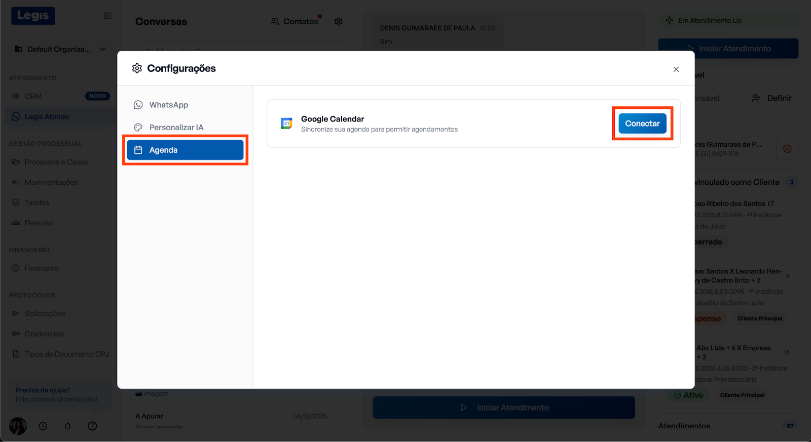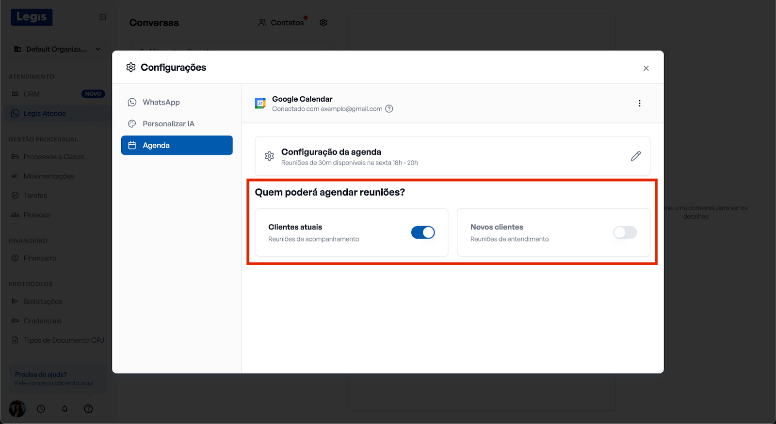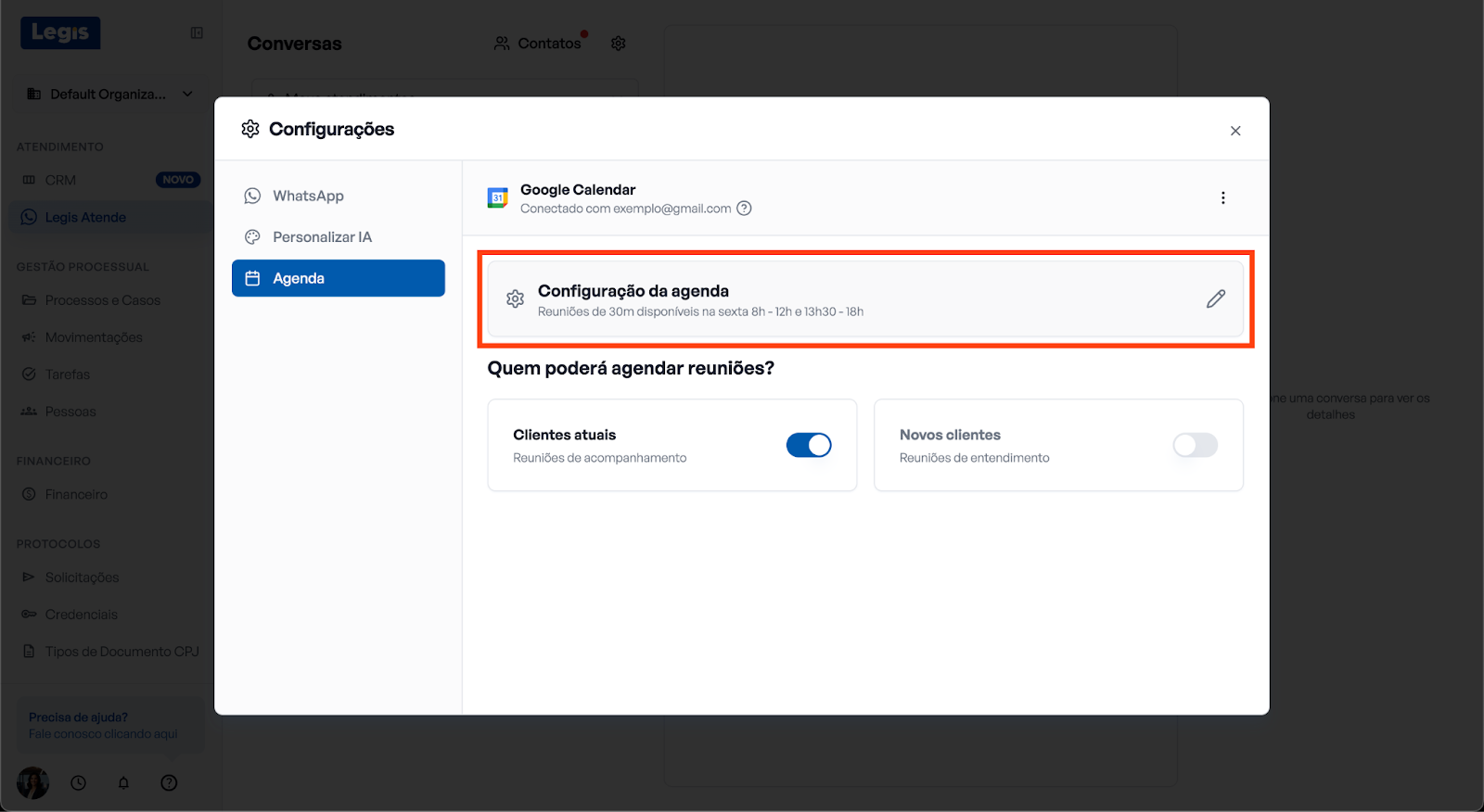 No Legis Atende, esse recurso funciona junto com a sua Agenda do Google. Isso quer dizer que, ao ativar a função, seus clientes poderão marcar reuniões com o seu escritório de uma forma fácil e automática. O sistema garante que os horários que aparecerem para agendamento sigam exatamente a sua agenda real. O Legis Atende verifica a Agenda do Google na hora, garantindo que não sejam oferecidos horários que você já tem compromisso, seja ele pessoal ou de trabalho.