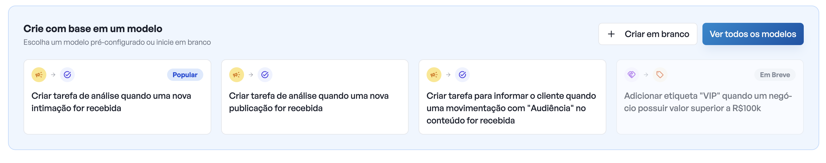 Modelos são "receitas prontas" para situações corriqueiras, como, por exemplo, criar tarefas a partir de novas movimentações.