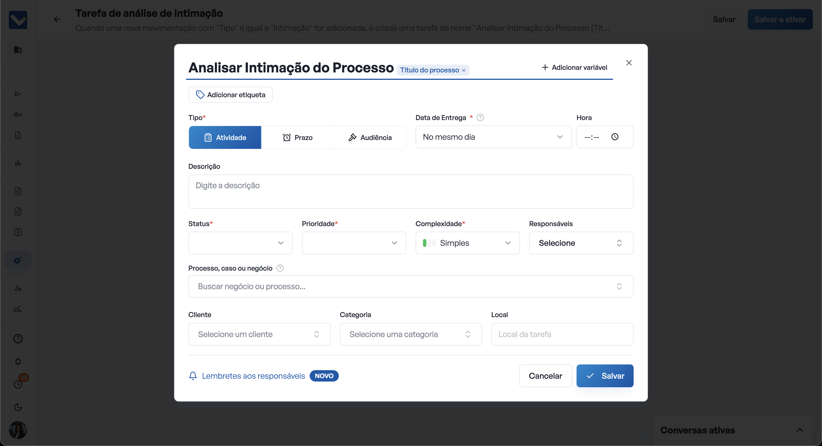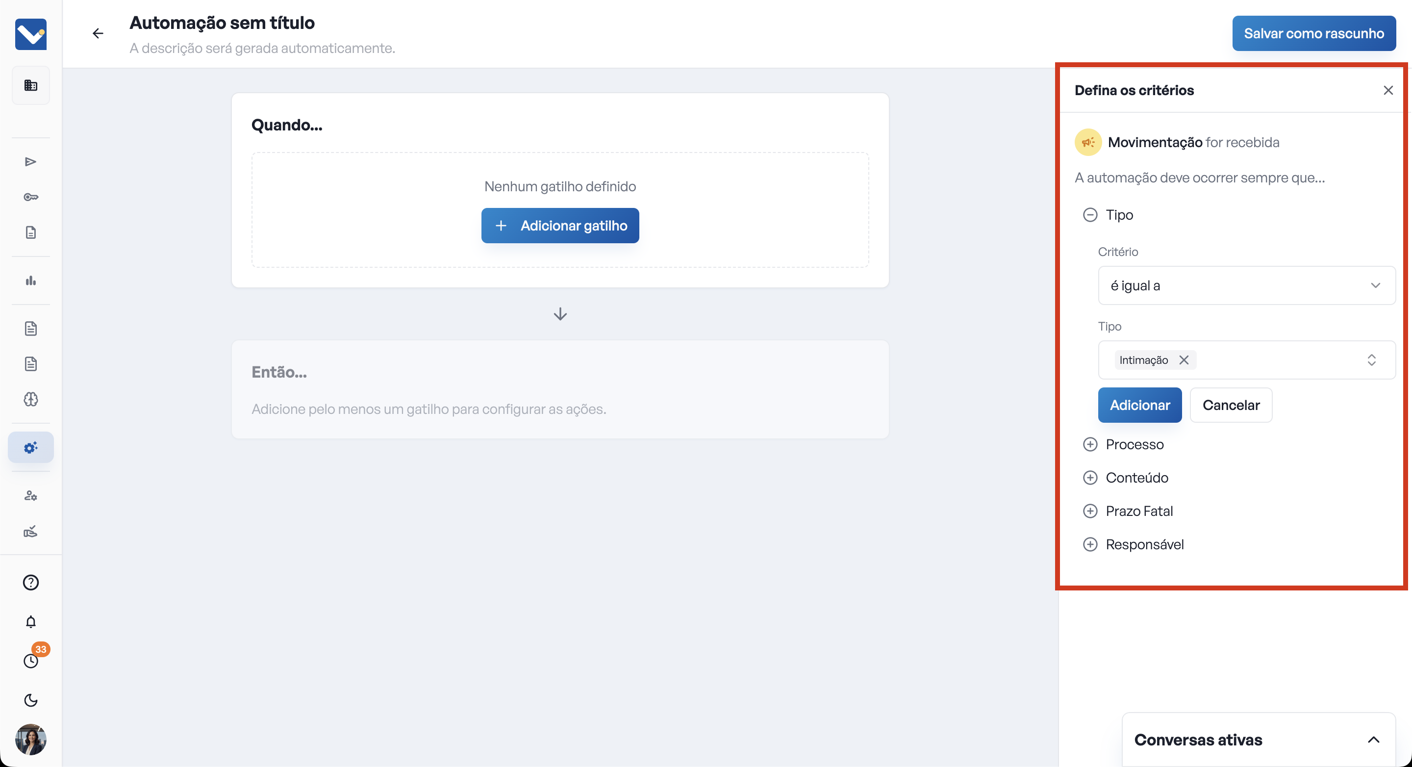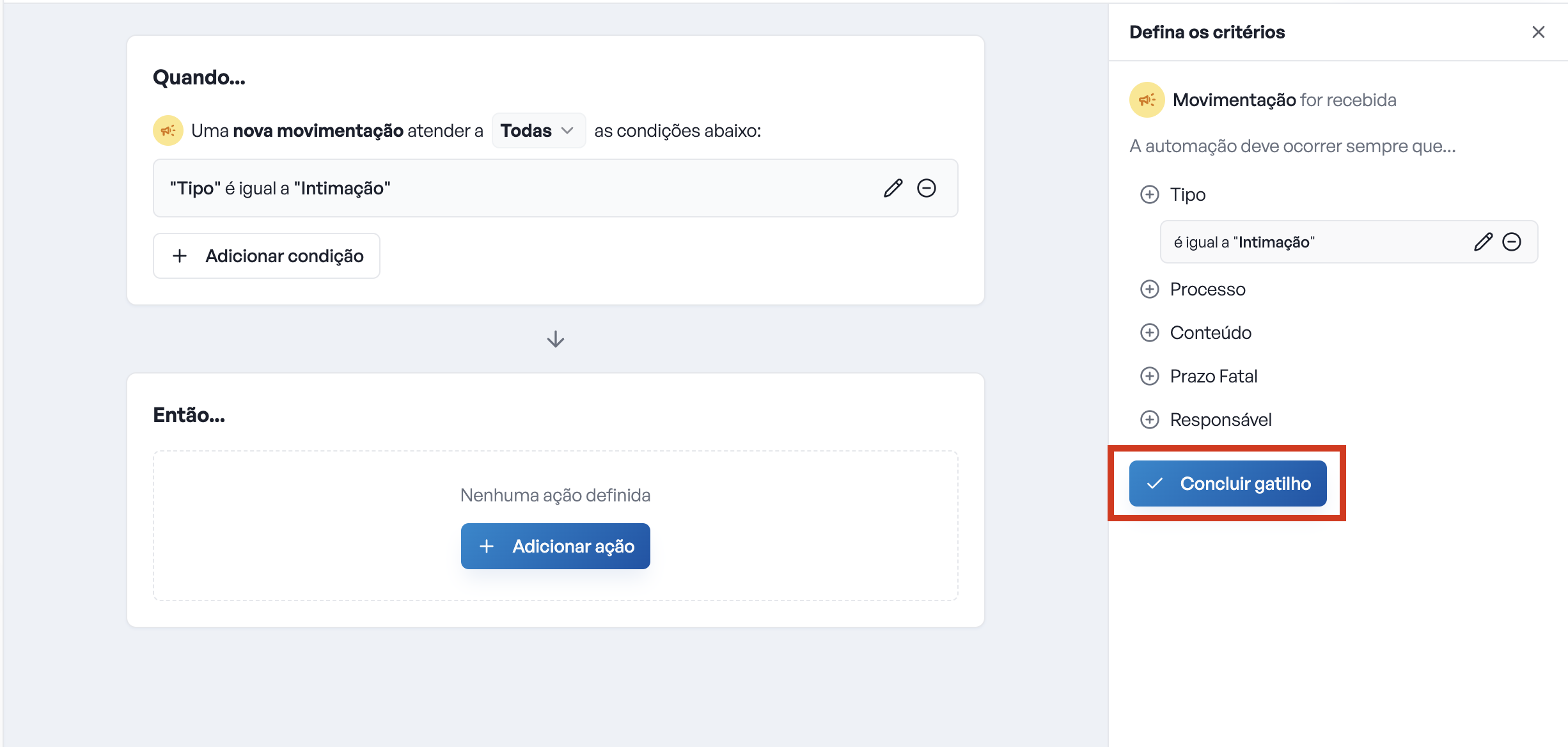 Defina as condições(s): Condições são filtros que o sistema usará para selecionar quais eventos devem disparar a automação. Podem ser adicionadas condições como, por exemplo, "Tipo: É igual a Intimação" e "Conteúdo: Contém “Audiência"". Você pode adicionar quantas condições desejar em um mesmo gatilho.