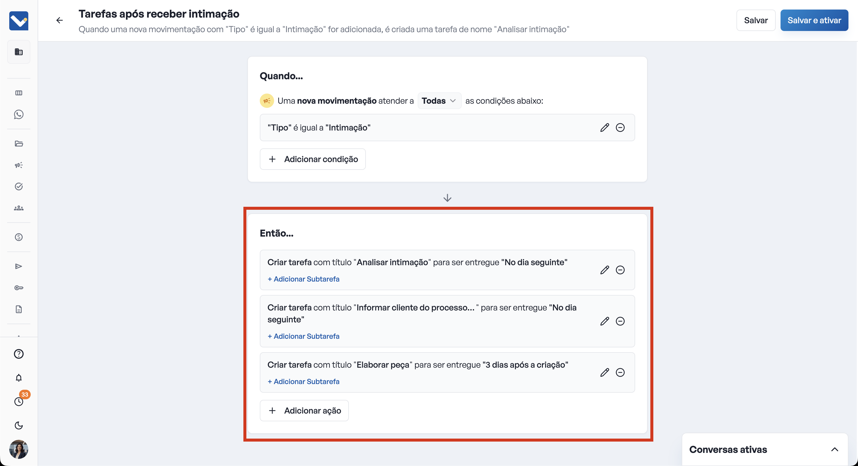 Por exemplo: uma automação pode, ao identificar uma intimação, criar uma lista de tarefas contendo as tarefas rotineiras para intimações - para isso, basta adicionar as tarefas como ações, como na imagem abaixo: