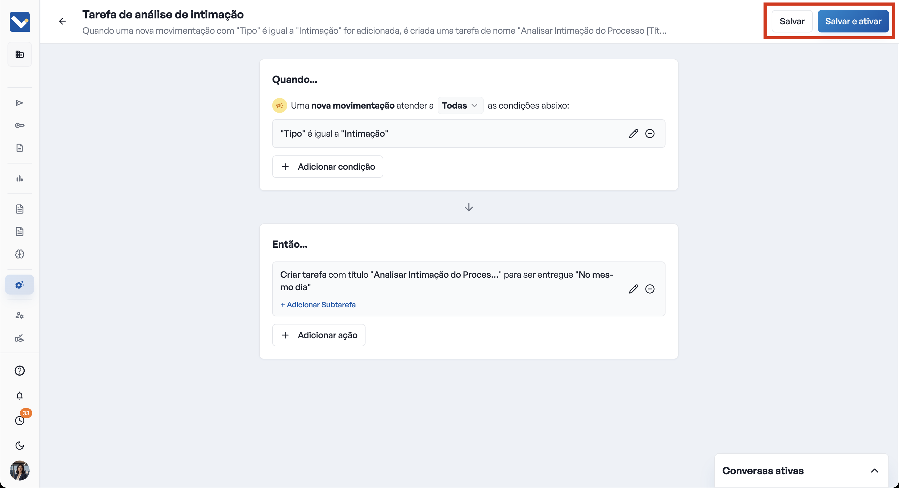 Salve e ative em outro momento ou Ative imediatamente: Clique em "Salvar" caso prefira salvar a automação mas ativar em outro momento. Clique em Salvar e ativar, caso prefira executar a automação imediatamente.