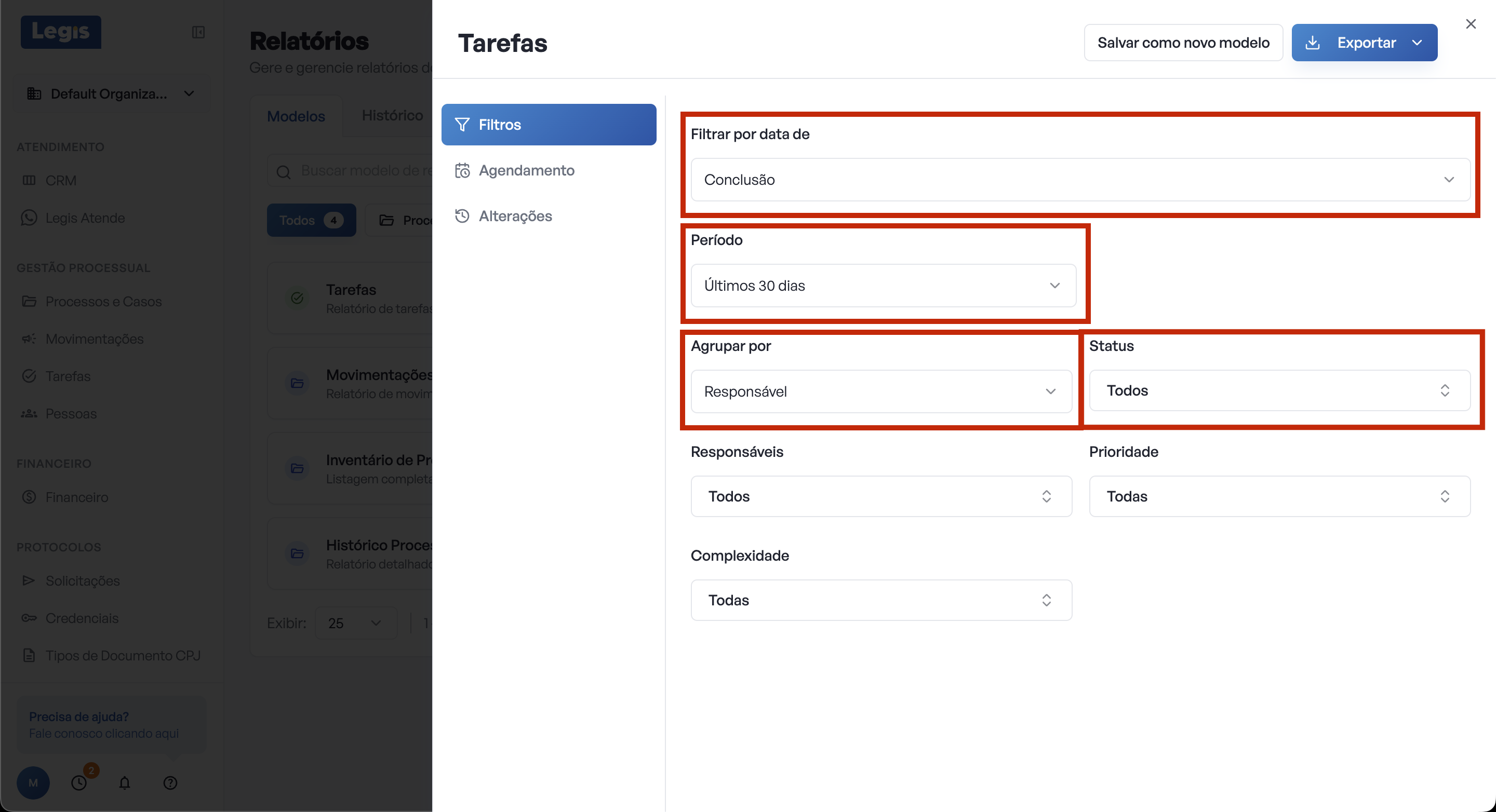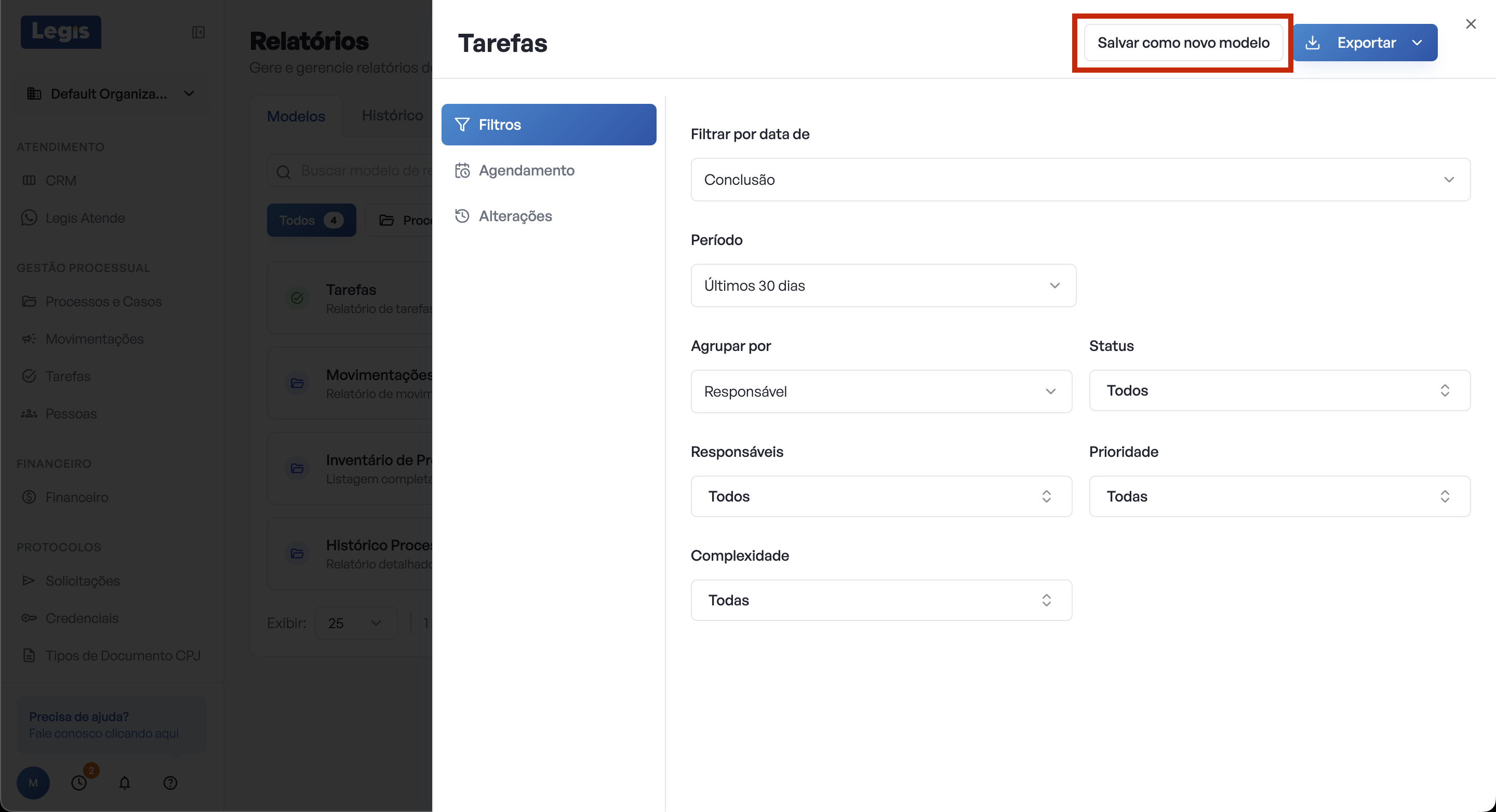 Clique no botão Salvar novo modelo que apareceu no topo. Na janela que abrir, dê um nome ao modelo - por exemplo: Tarefas concluídas por colaborador no mês anterior. Clique em Salvar.
