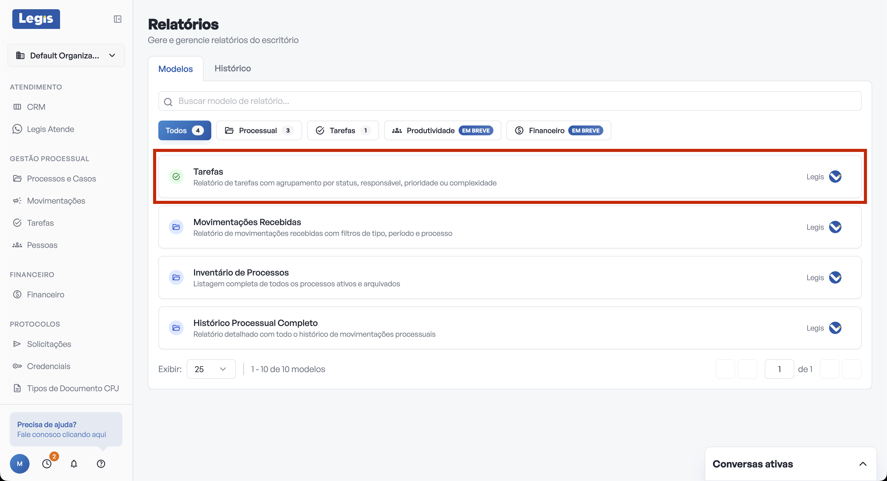 Na tela inicial do módulo, clique no modelo Tarefas, dentro dos Modelos Prontos.