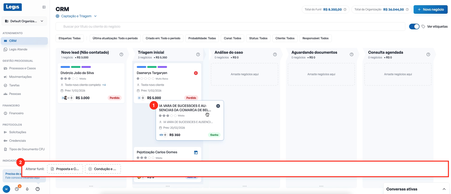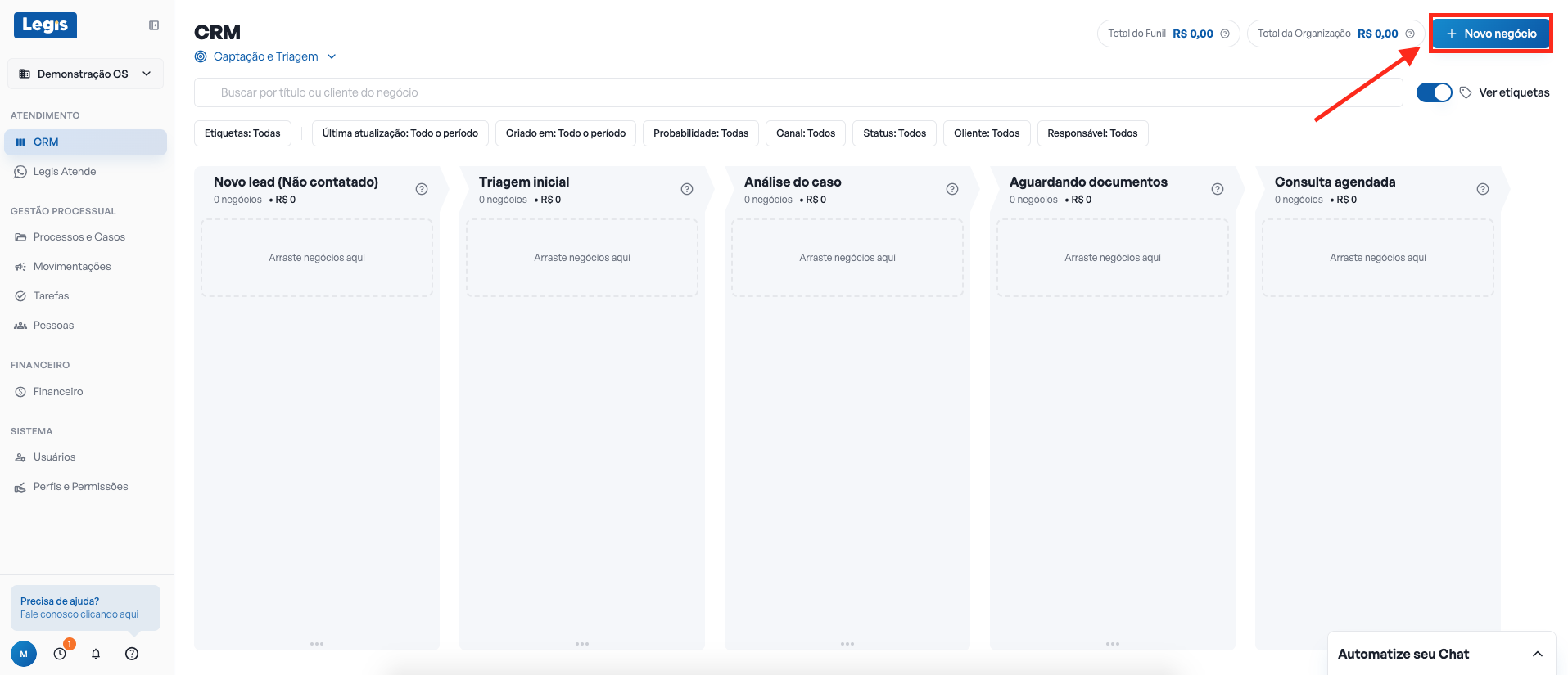 Negócios são as oportunidades reais de contratação de serviços jurídicos que o escritório possui e se move através das etapas conforme a negociação avança, desde o primeiro contato com um potencial cliente até o fechamento (ou perda) dessa oportunidade.