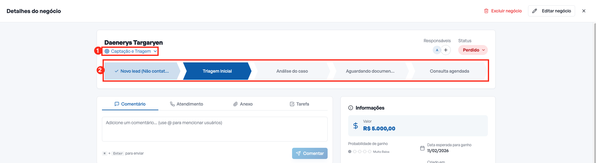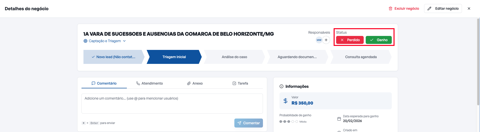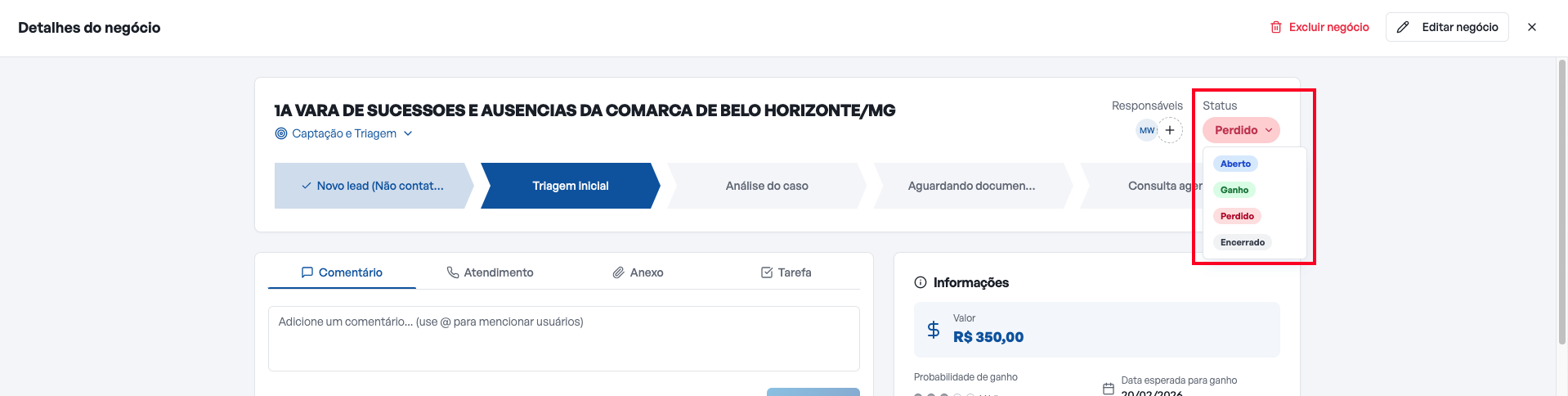 É possível alterar o status diretamente na visualização dos detalhes do negócio