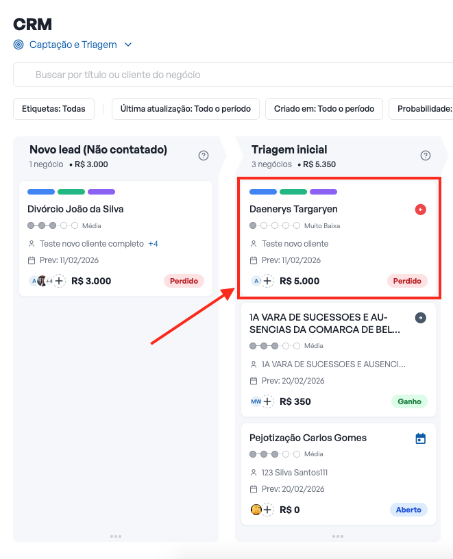O negócio é movido instantaneamente para a primeira etapa do novo funil ou