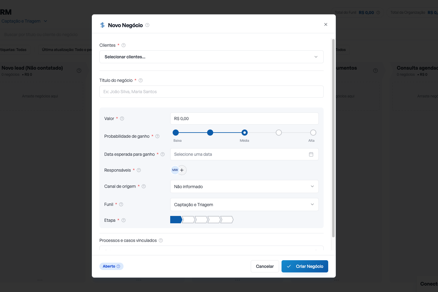 Não necessariamente. Negócios representam oportunidades comerciais, não execução jurídica. Crie negócio quando há uma tratativa de contratação. Se um cliente recorrente simplesmente envia um novo processo, você pode cadastrar o processo diretamente sem passar pelo CRM. Use CRM para captação, não para gestão operacional.