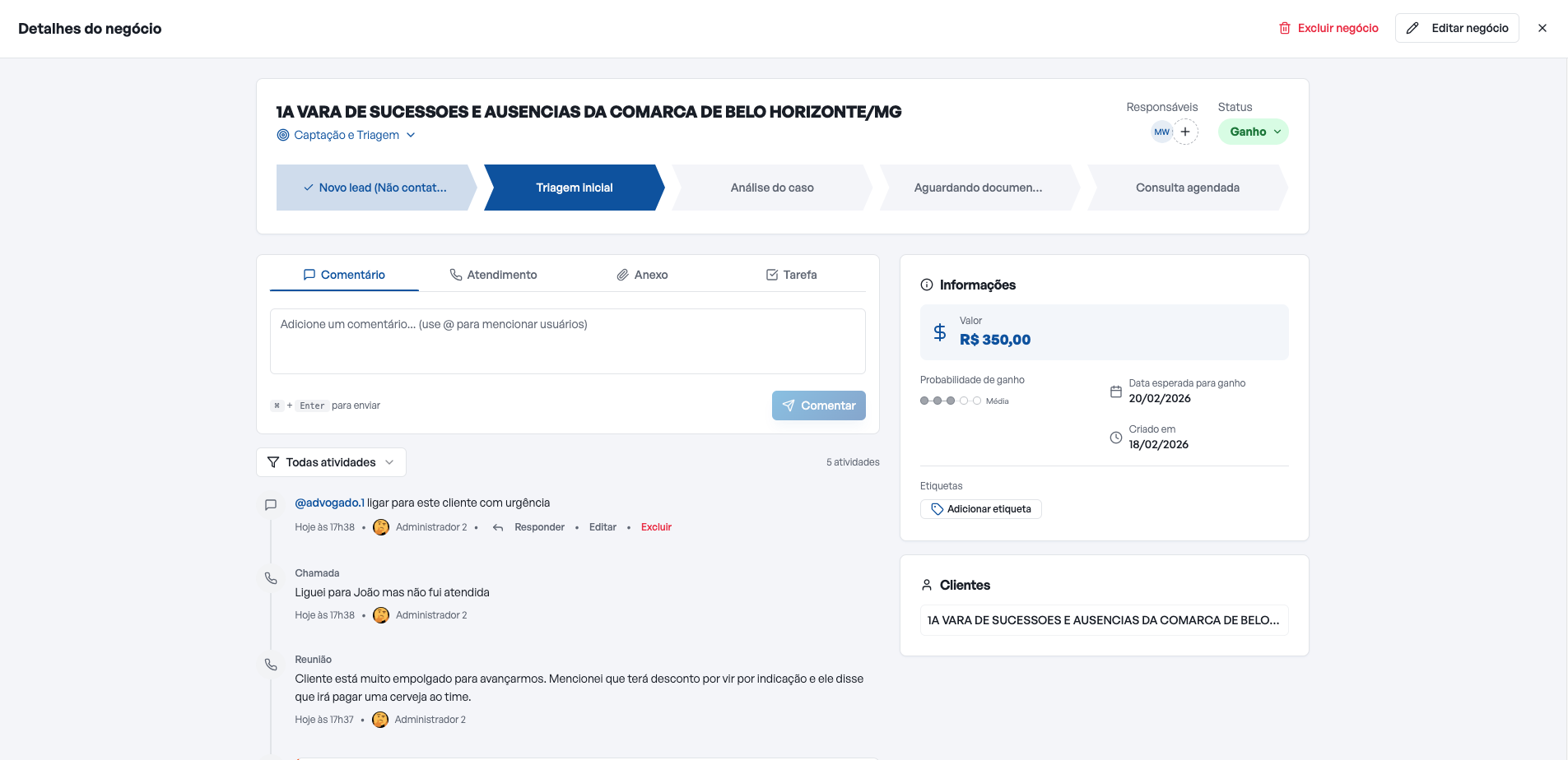 Além das informações principais do negócio como valor, funil e etapa atual, probabilidade de ganho, clientes, etc., o Legis possibilida registros variados para o escritório manter um Histórico de Atividades de atendimento ao negócio.