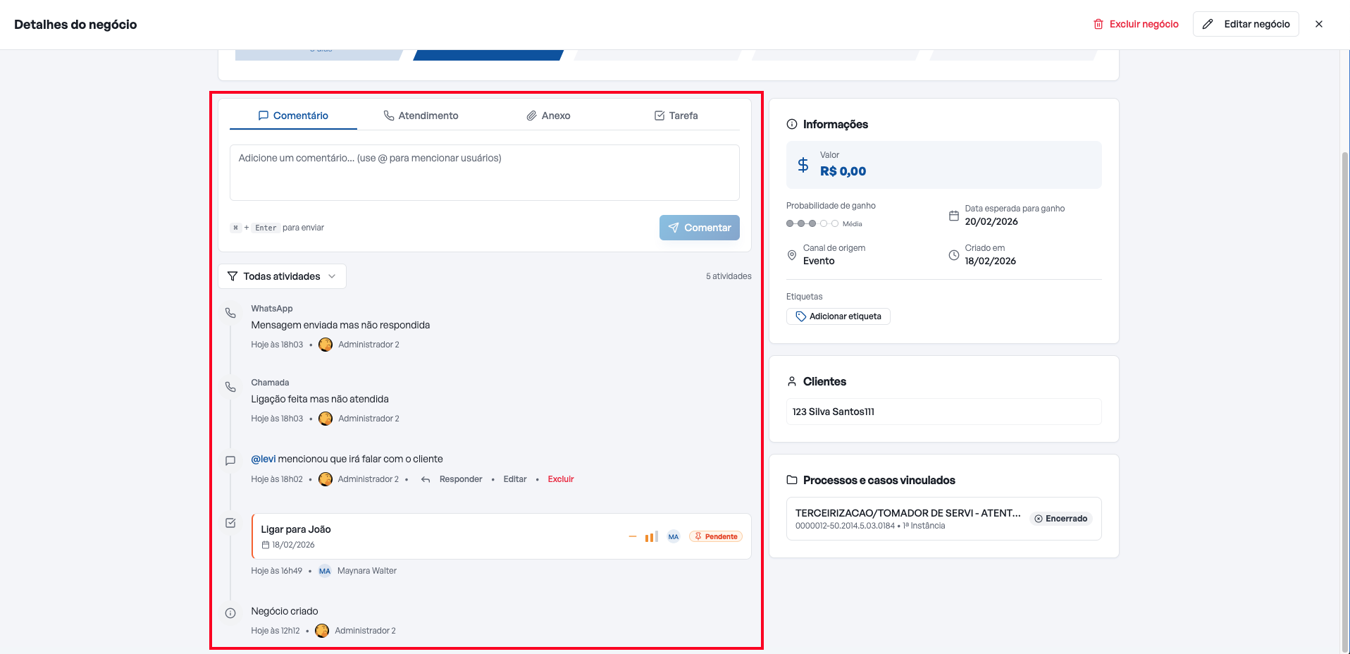 O histórico funciona como a memória completa do negócio: todos os comentários, atendimentos, anexos e tarefas ficam registrados em ordem cronológica.