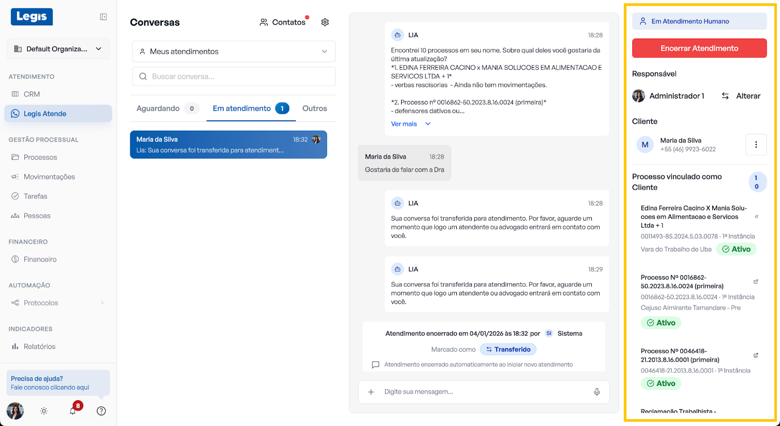 A conversa será vinculada ao cliente e o Painel de Processos será exibido.