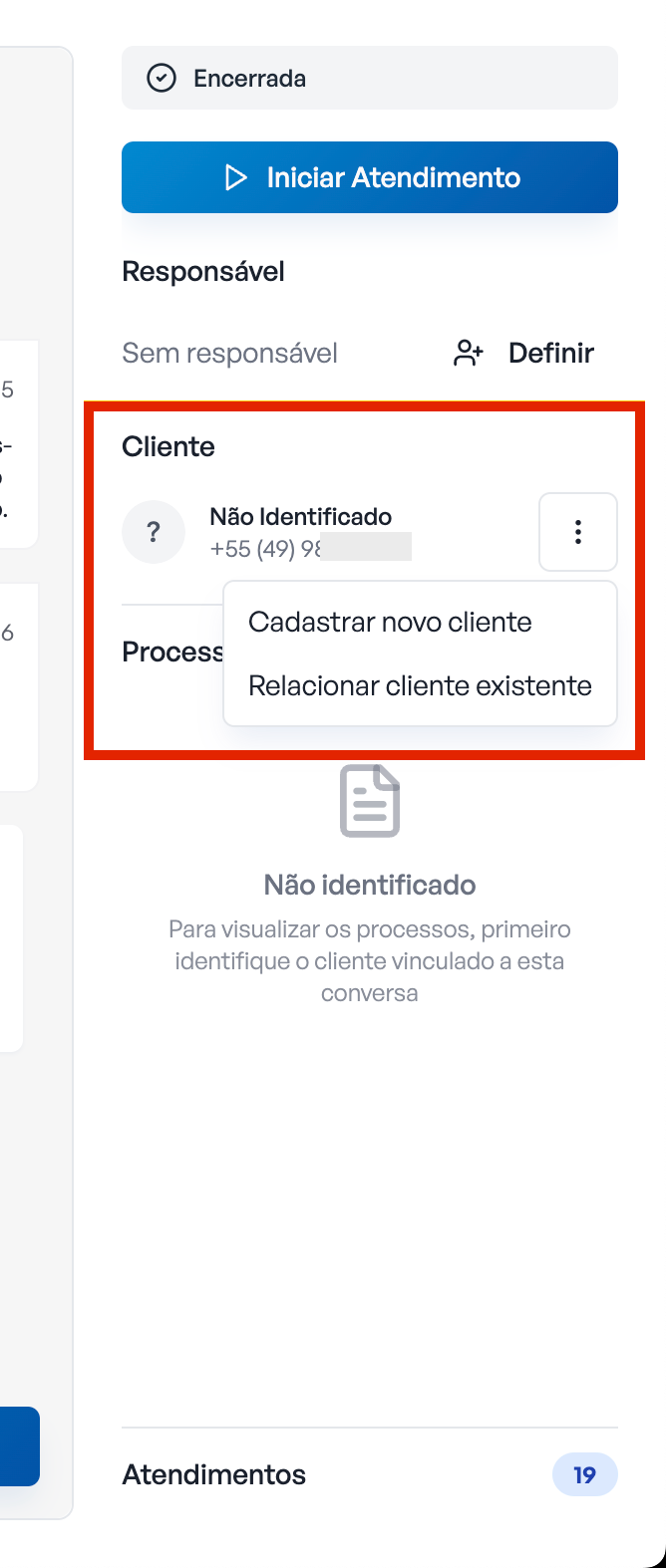 No painel lateral direito, você verá, abaixo do título “Cliente”, o texto “Não Identificado” e o número de WhatsApp.