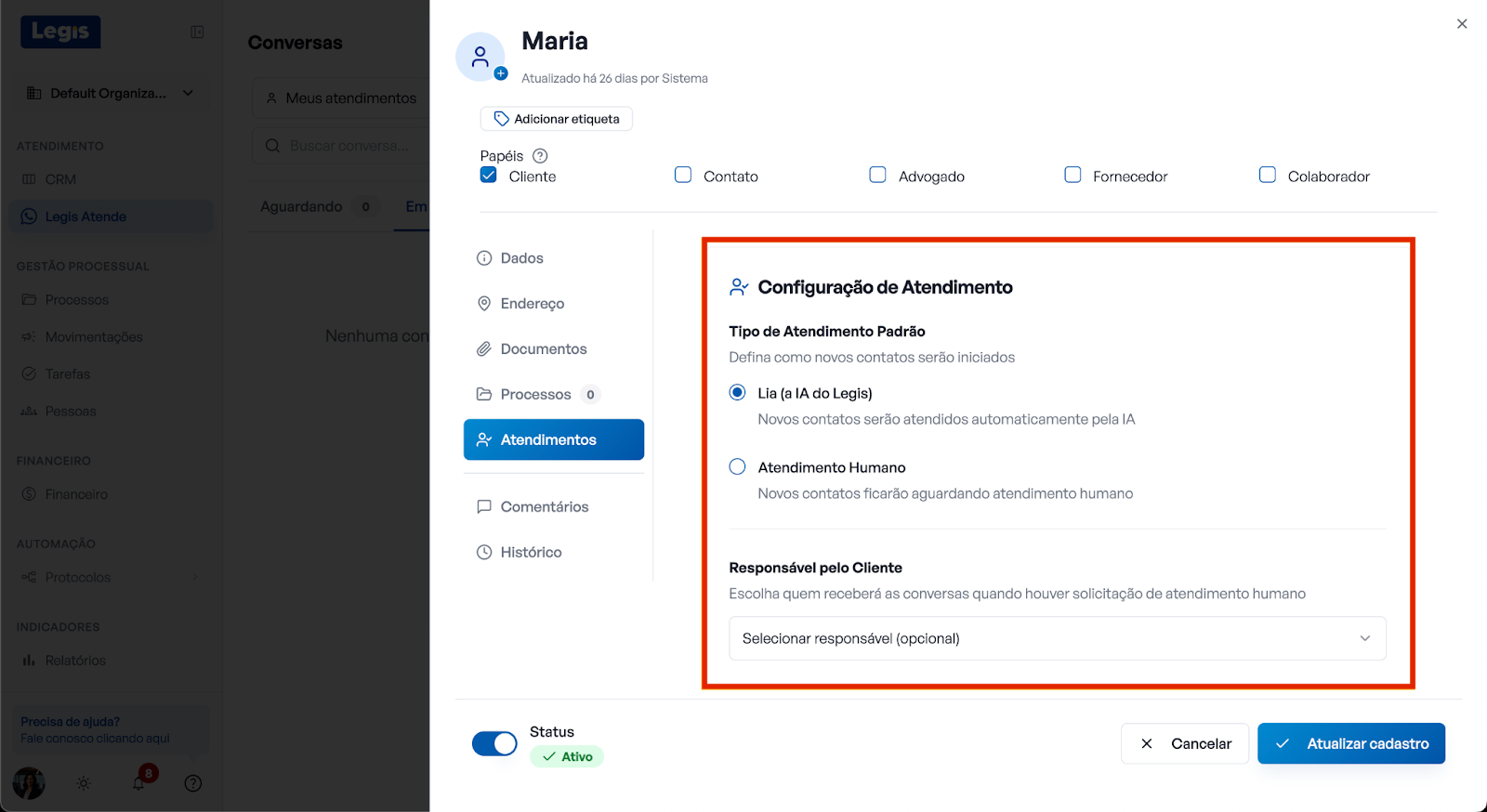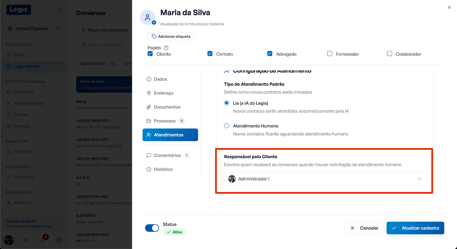 Para ter maior organização na equipe e garantir um atendimento personalizado, você pode definir um "Responsável Fixo" para cada cliente. Quando este cliente chamar (e precisar de atendimento humano), a conversa será direcionado automaticamente para este atendente/advogado, sendo exibida somente na aba "Aguardando" do painel de atendimentos dele.