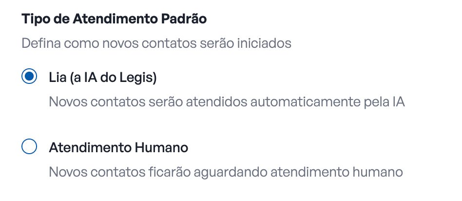 Selecione "Lia (a IA do Legis)" ou "Atendimento Humano".