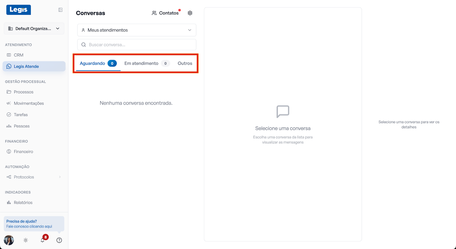 Acesse o módulo Legis Atende no menu principal. Por padrão, os atendimentos exibidos são filtrados por conversas em que o usuário atual é o responsável ou que não têm responsável relacionado.