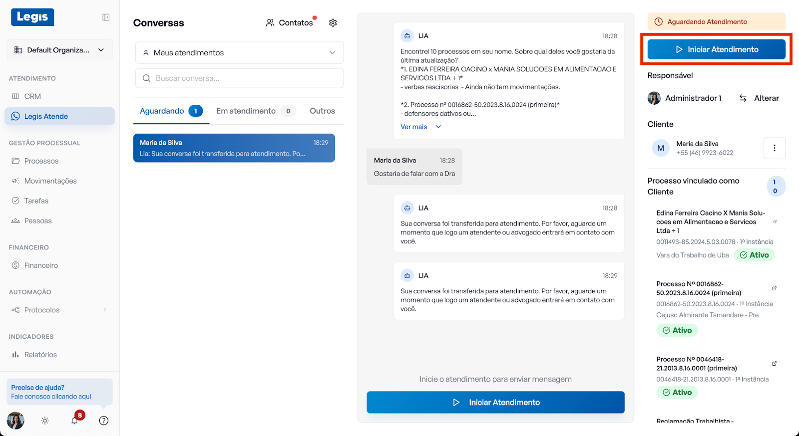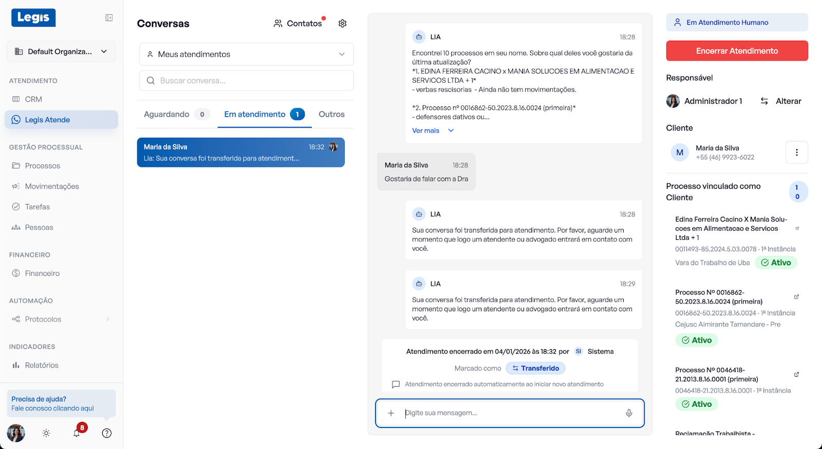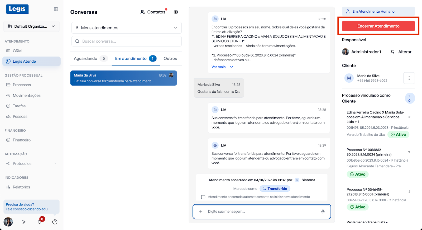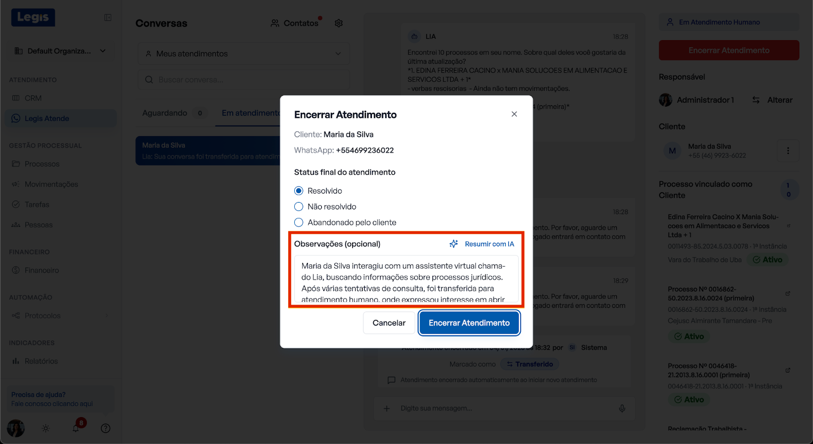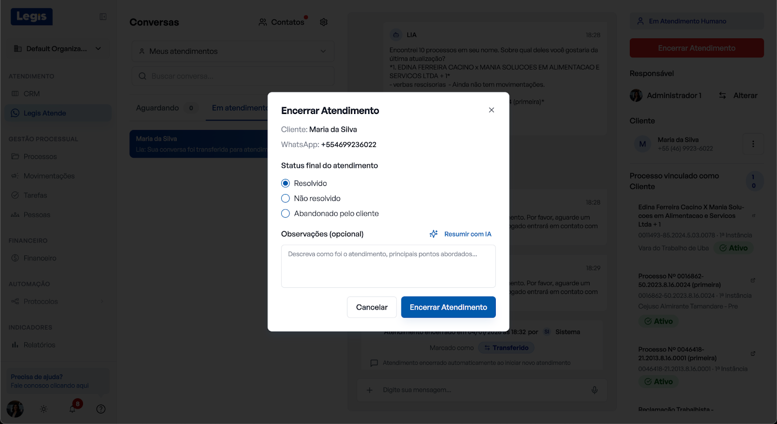É possível encerrar um atendimento - ou seja, reativar a Lia - diretamente pela conversa no WhatsApp, mantendo seu painel de conversas do Legis sempre atualizado.